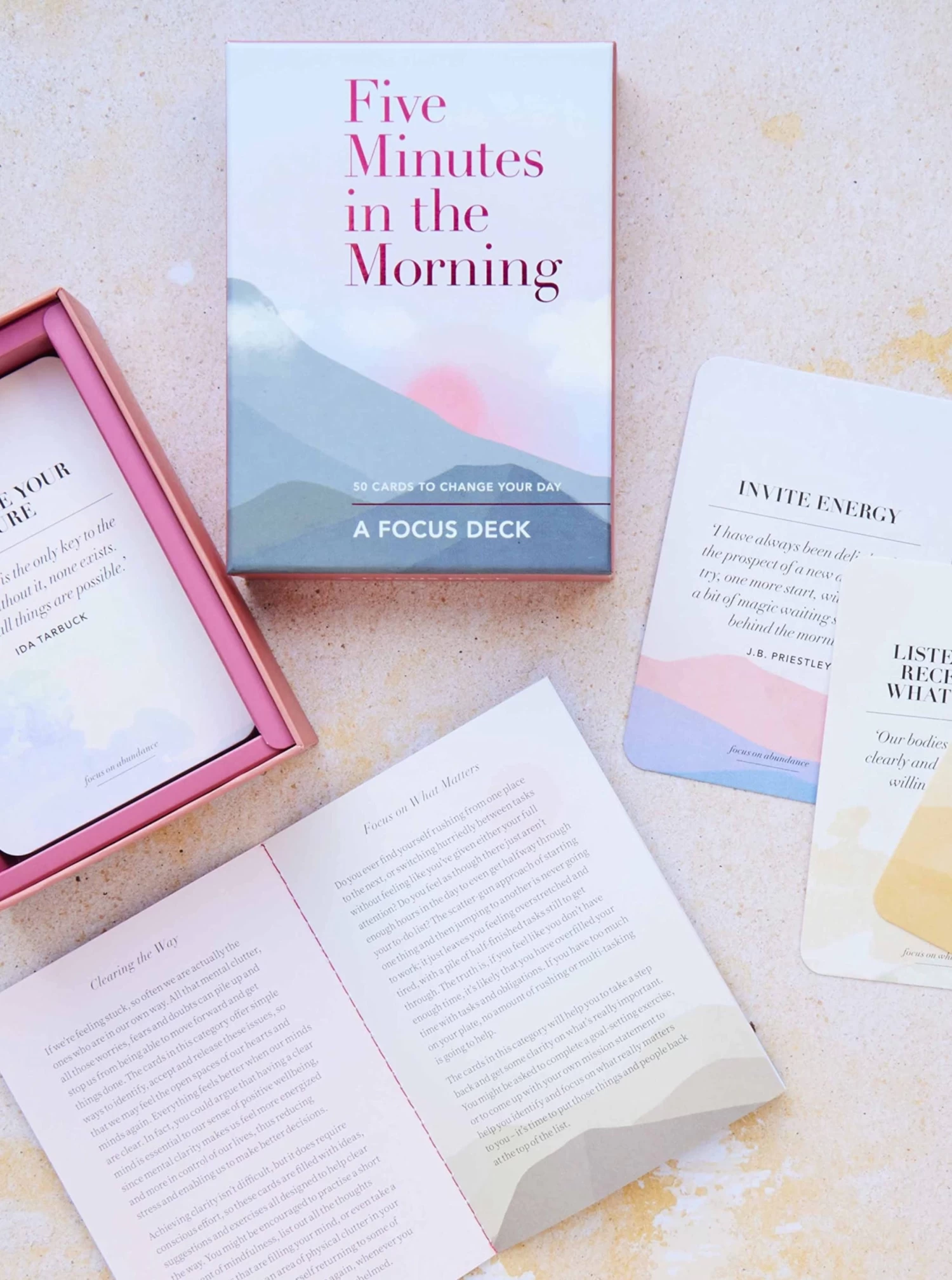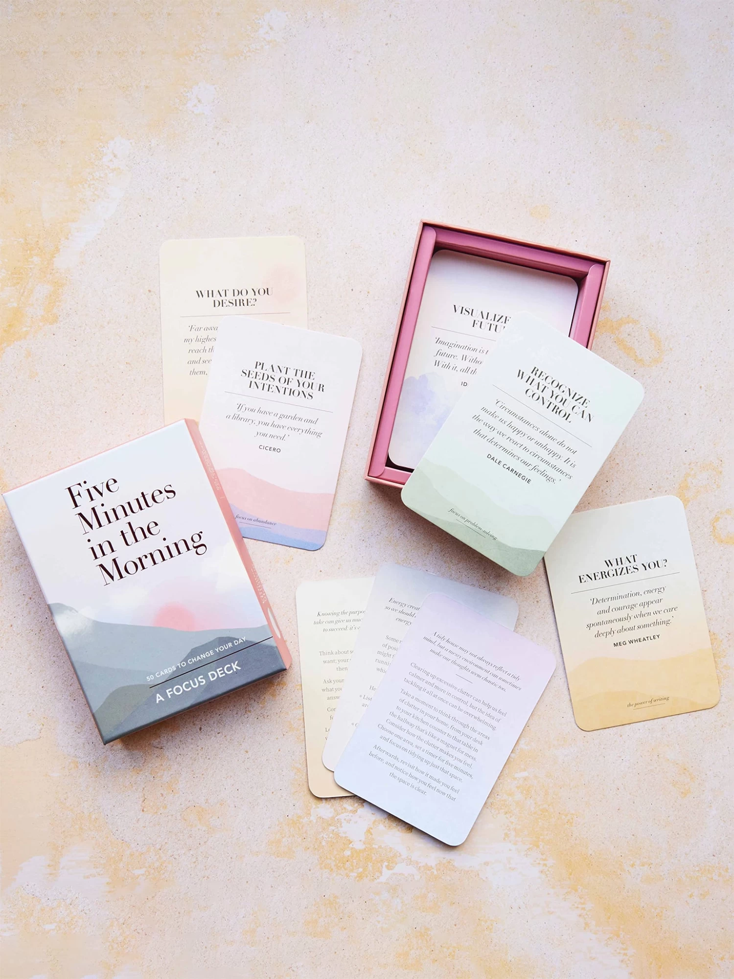 Whether you pull a card from the deck at random, shuffle through the deck to find the card that fits your morning best, or select a card for yourself the night before, the Five Minutes in the Morning Focus Deck helps you set an intention for your day with prompts and short creative exercises to help you get the most out of your mornings and live more mindfully.