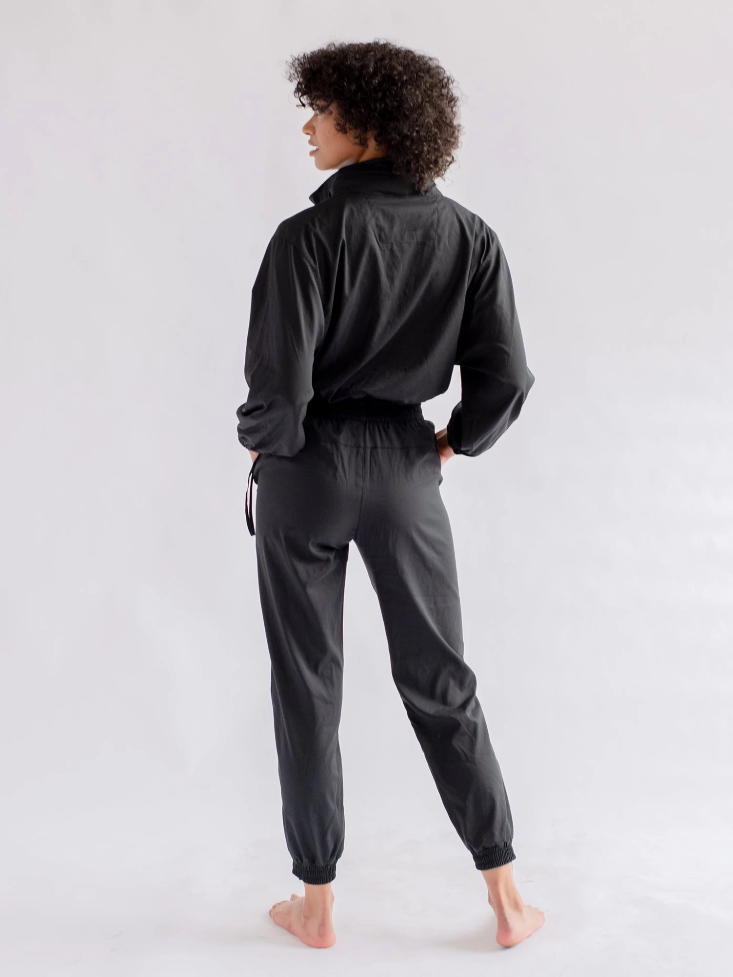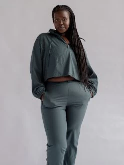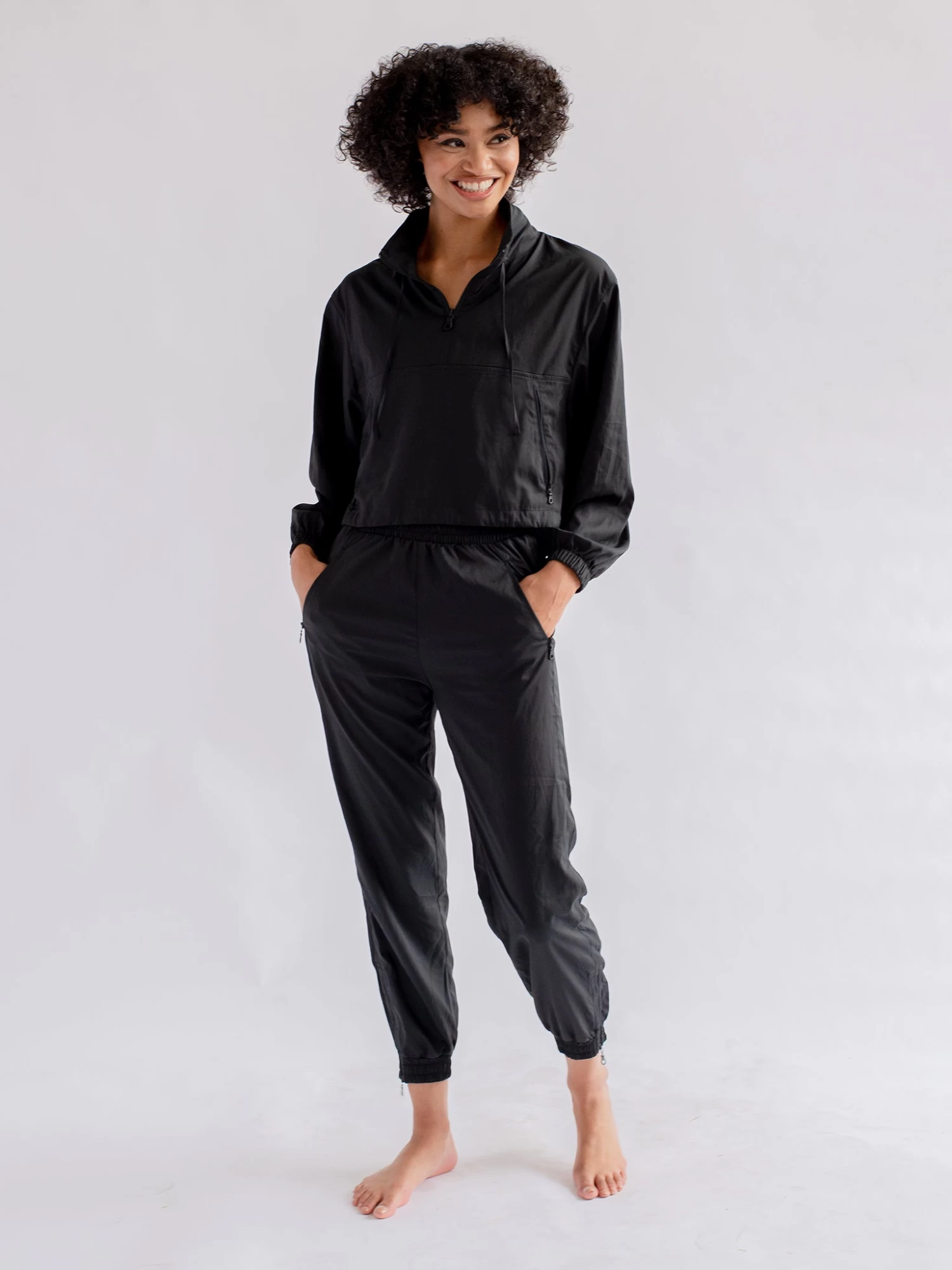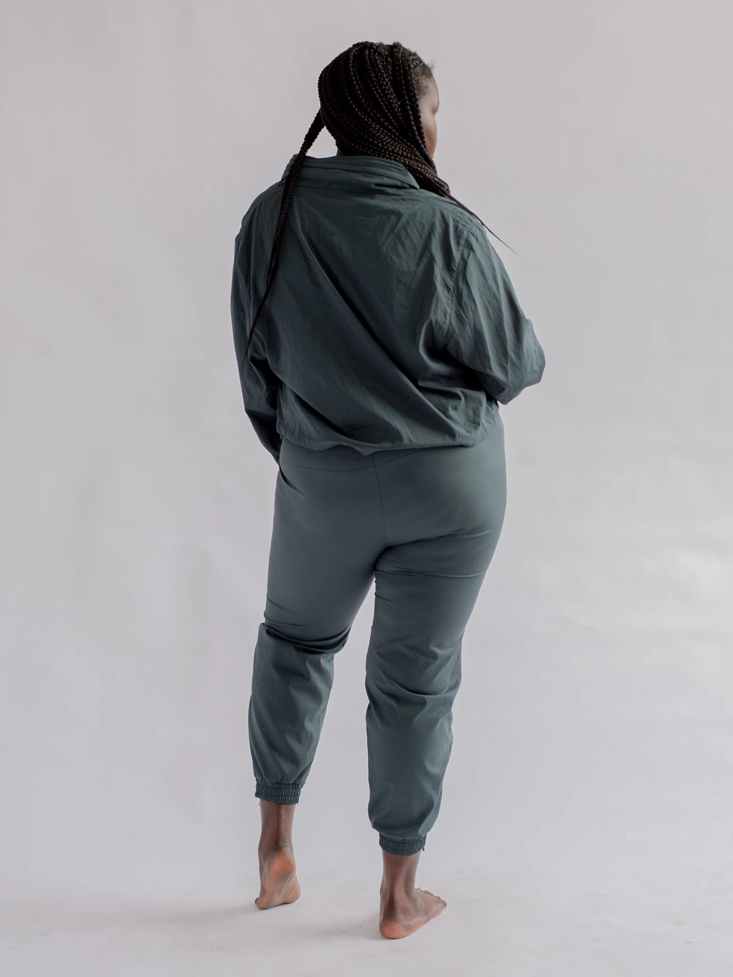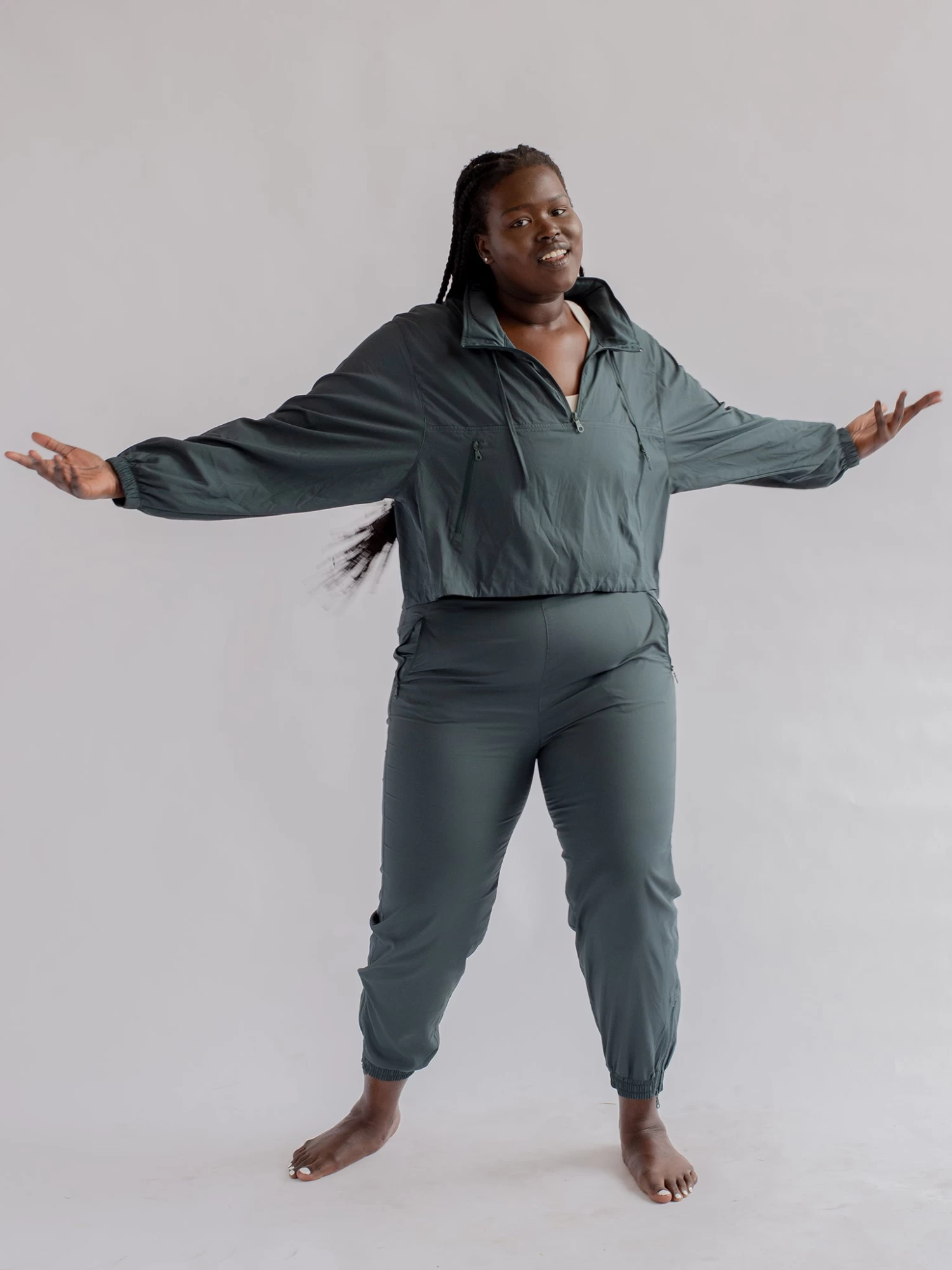 Don’t forget to stretch. The Summit Track Pant is a high waisted pant you can easily layer over your leggings or shorts for some added warmth. They also have nifty ankle zippers so you don’t have to take your shoes off when taking them off (a big plus for when your hike starts in the cold morning and goes into the hot afternoon). To take care of it, machine wash cold with like colors and line dry flat.