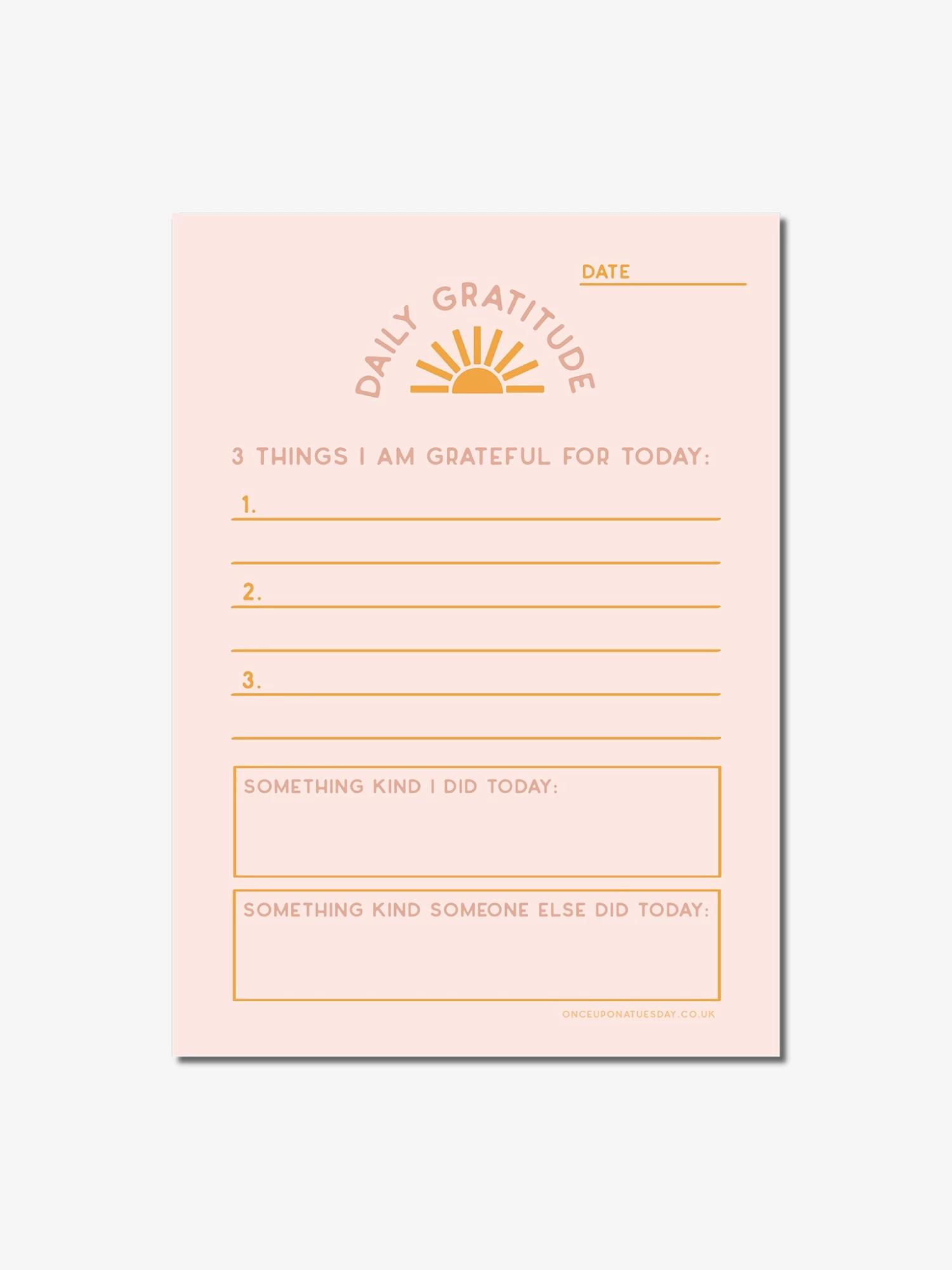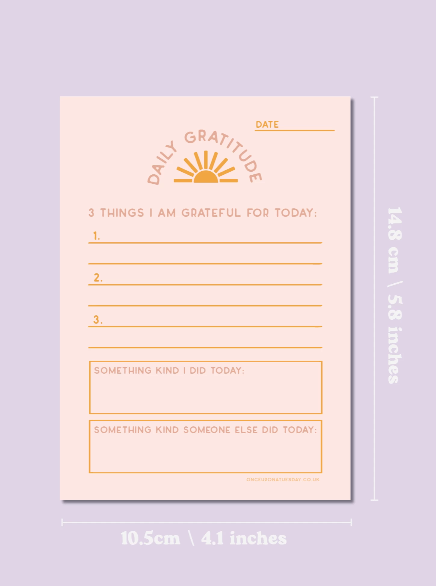 An A6 size Daily Gratitude Pad to list 3 things you are grateful for today – plus space to note down something kind someone did for you, and you did for others.