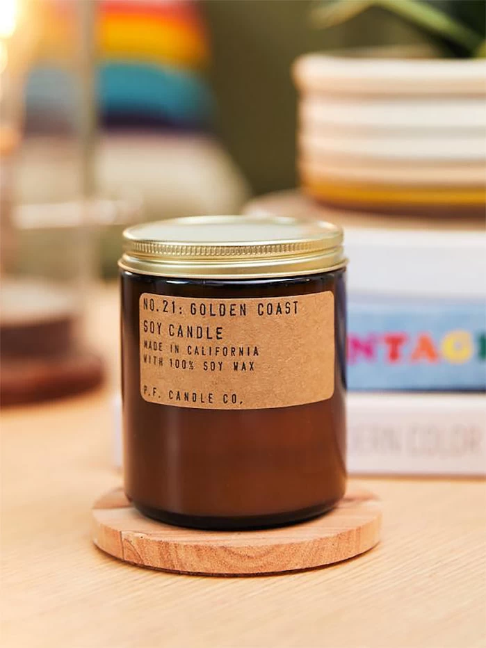 These beautiful P.F. Candle Co. soy candles are hand-poured into apothecary inspired amber jars with signature kraft label and a brass lid in their studio in Los Angeles. Featuring 100% natural domestically-grown soy wax, phthalate-free and paraben-free fragrance oil and a cotton wick for a clean, even burn.