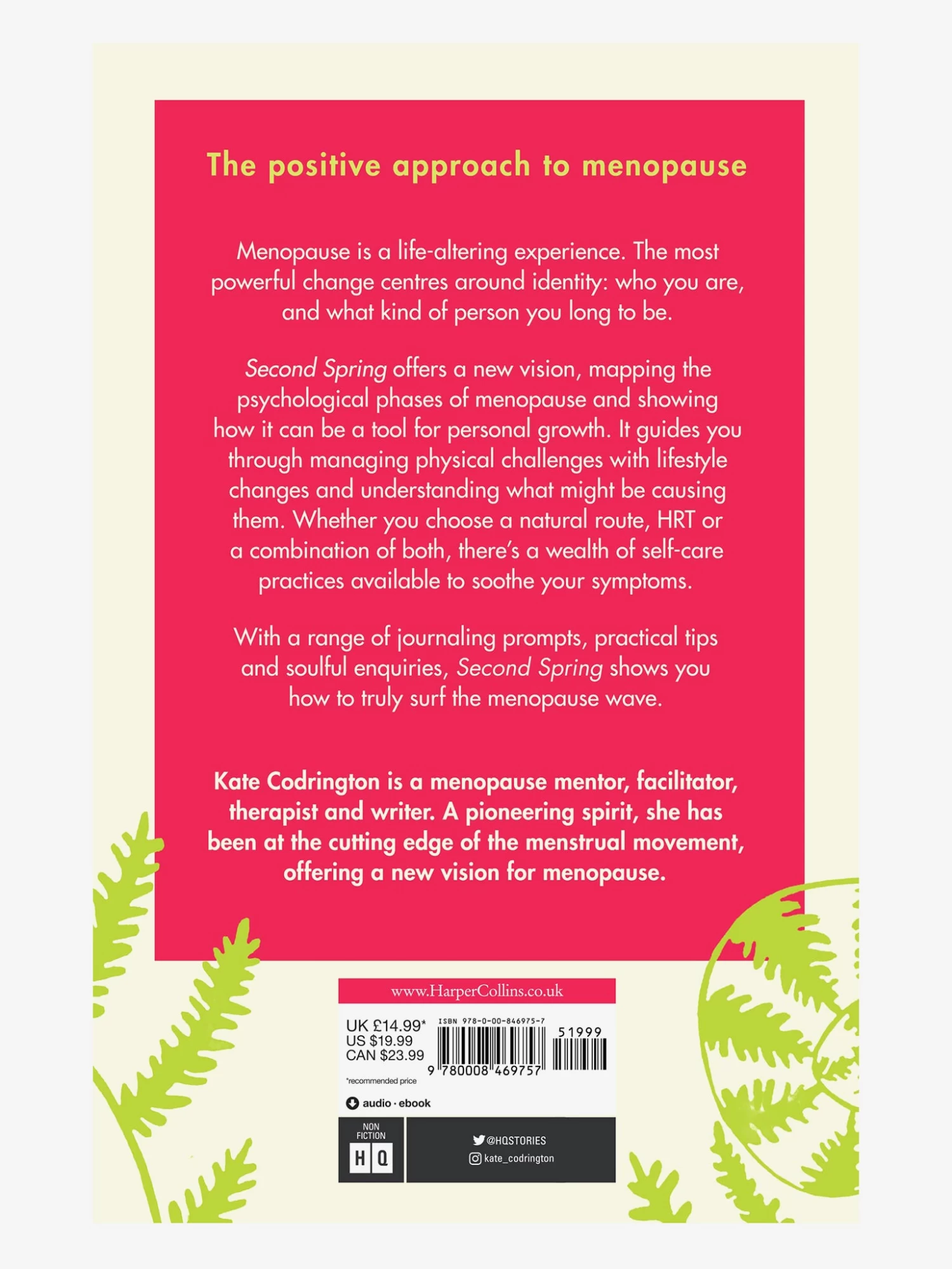 Second Spring offers a new vision for menopause, mapping the psychological phases and showing how this period in your life can be a time of personal growth. Like your slightly sweary best friend, Kate Codrington guides you through managing physical challenges with lifestyle changes and understanding what might be causing them. Whether you choose a natural route, HRT or a combination of both, there’s a wealth of self-care practices available here to soothe your symptoms. These include journaling prompts, practical tips and soulful enquiries real-life solutions for managing symptoms with kindness, helping you to become the person you always longed to be.