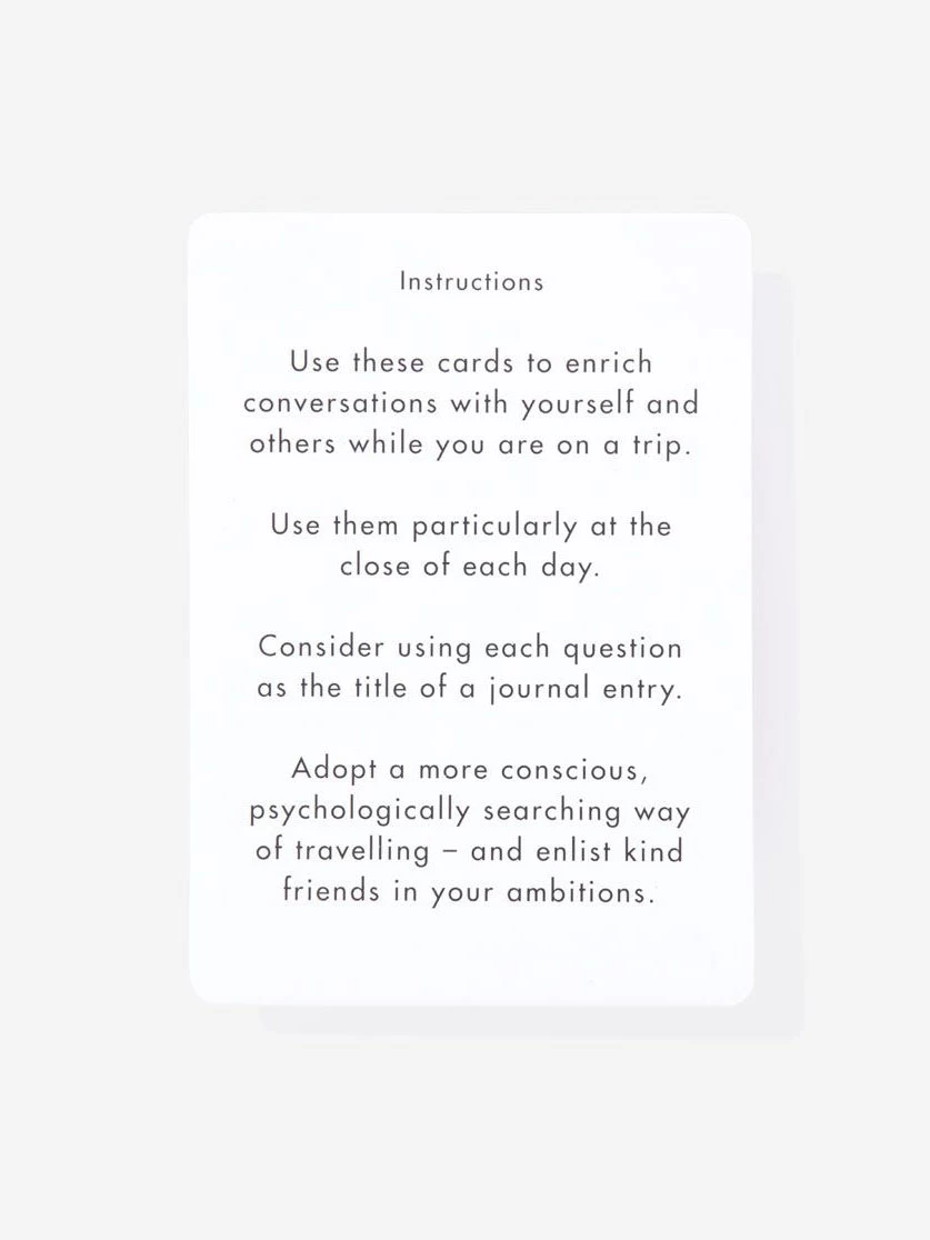 1. Use these cards to enrich conversation with yourself and others while you are on a trip.