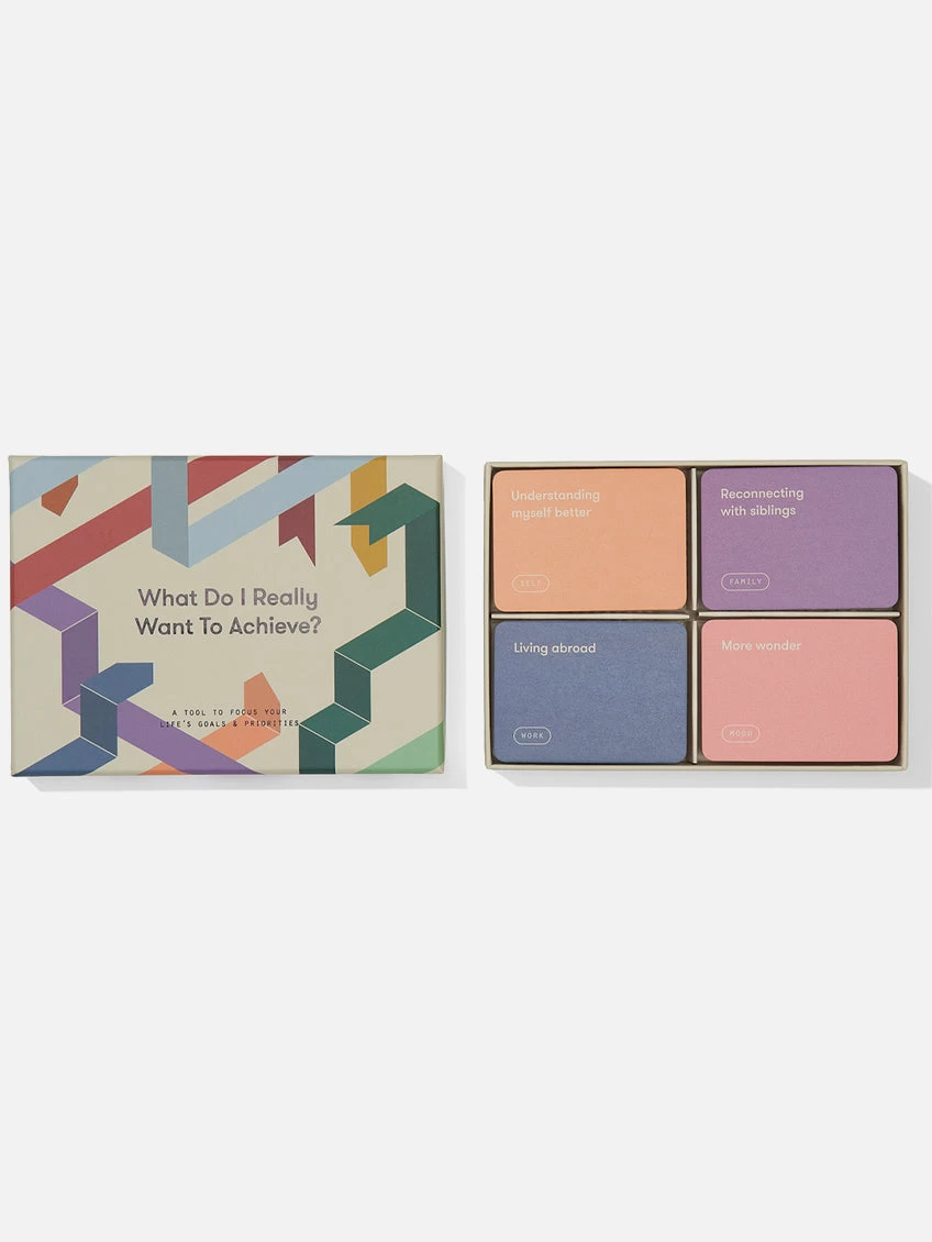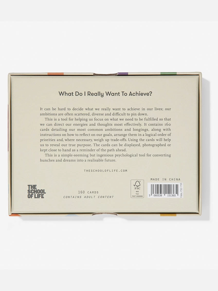 It can be hard to decide what we really want to achieve in our lives; our ambitions are often scattered, diverse and difficult to pin down. This deck contains 160 cards detailing our most common ambitions and longings, along with instructions on how to reflect on our goals, arrange them in a logical order of priorities and, where necessary, weigh up trade-offs. Using the cards will help us to reveal our true purpose. The cards can be displayed, photographed or kept close to hand as a reminder of the path ahead. This is a simple-seeming but ingenious psychological tool for converting hunches and dreams into a realisable future.