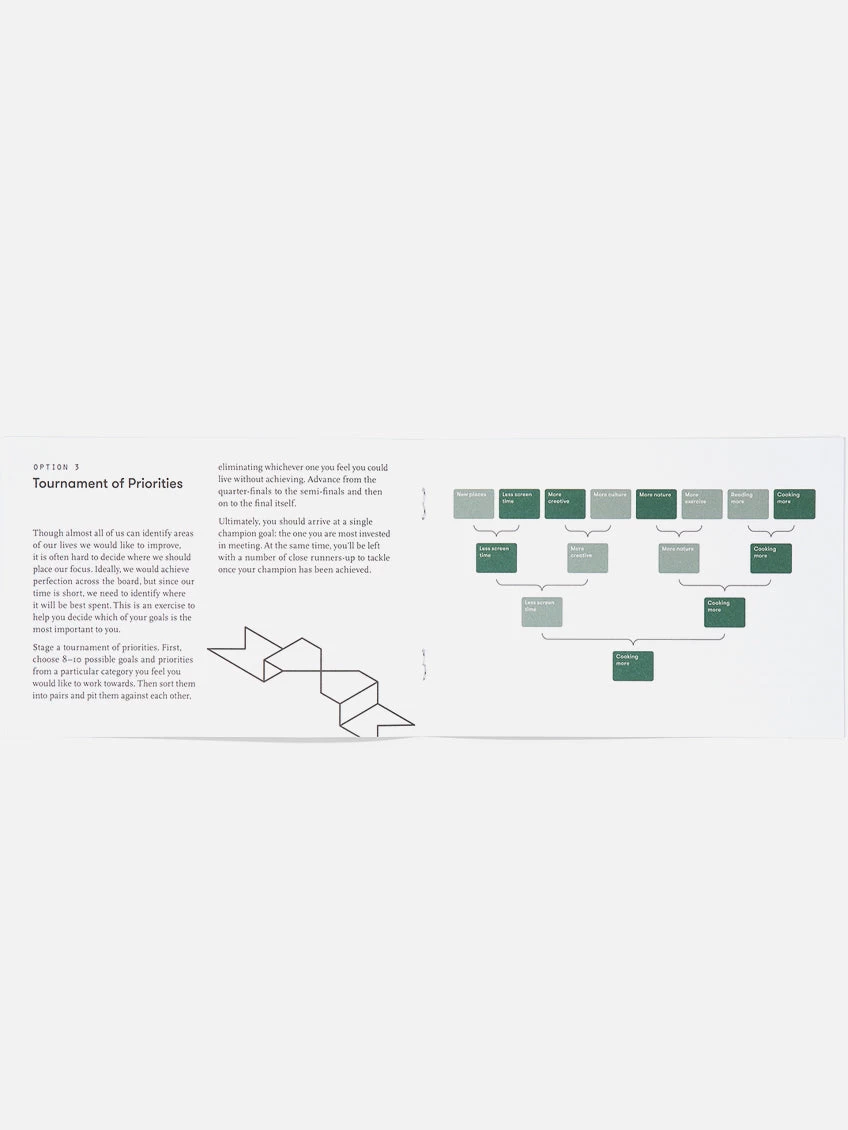 The School of Life has designed the exercises to give you a means of selecting and organising your goals, helping you determine which are the most important, urgent, realistic or meaningful, so that you can establish a plan for achieving or prioritising those you choose.