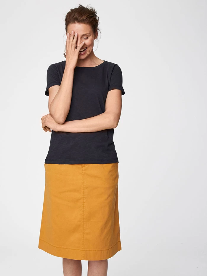 In a slub jersey, it’s super soft and stretchy, and was made in a Fairtrade factory in India. This simple tee comes with a round neck and short sleeves, and can be worn with anything in your wardrobe – tucked into trousers and skirts, or even layered beneath pinafores.