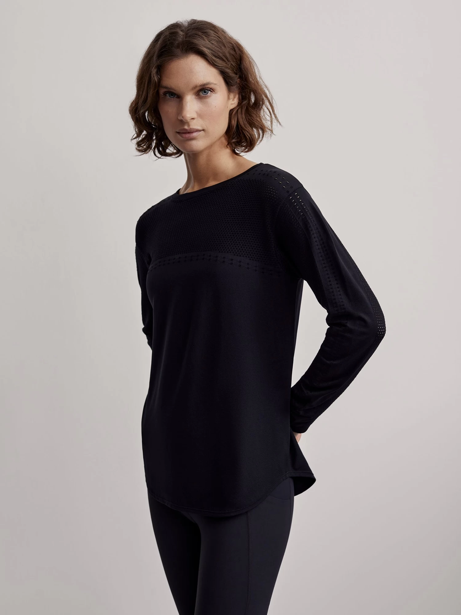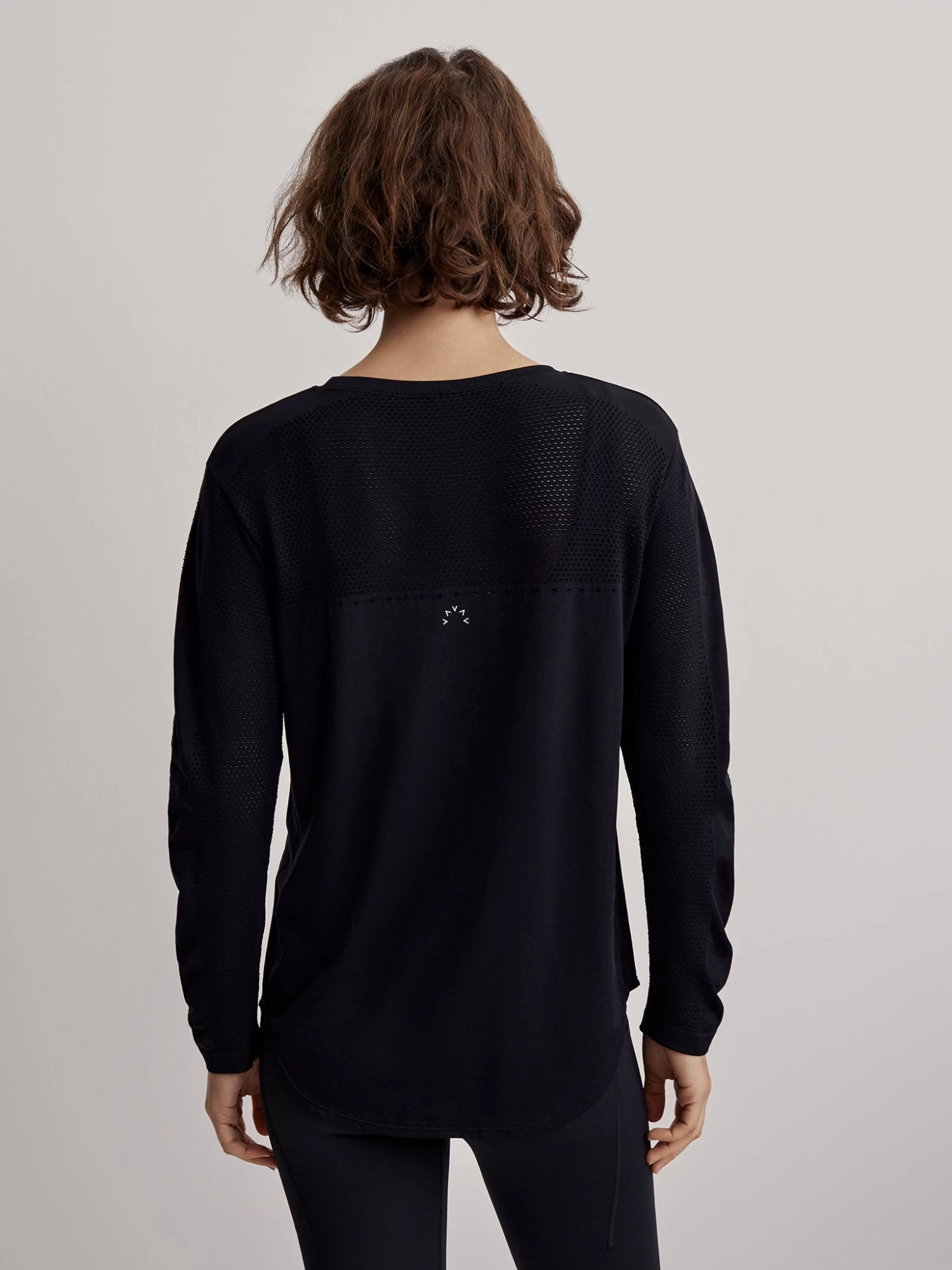 Crafted in soft Recycled Micro jersey, this seamless top features full-length sleeves, a longline body with scooped back hem and breathable mesh perforation that allows for full freedom of movement. The perfect lightweight base layer for active days.