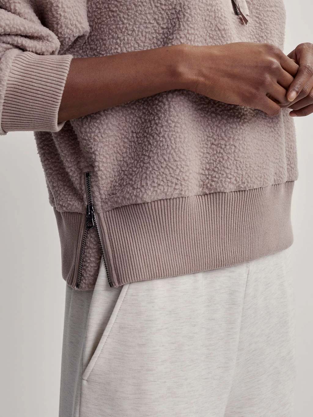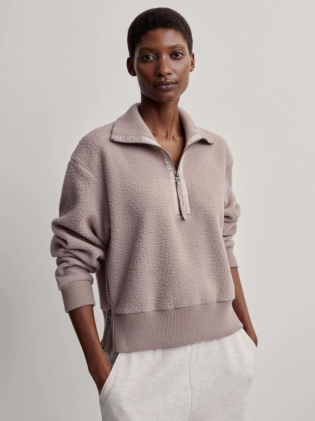 Spotlighting Varley’s 100% Recycled Plush Borg Fleece, this style is cut with a half-zip collar, ribbed cuffs and loose fit sleeves. Trademark side zip detailing and a luxe sateen trim elevate the design.