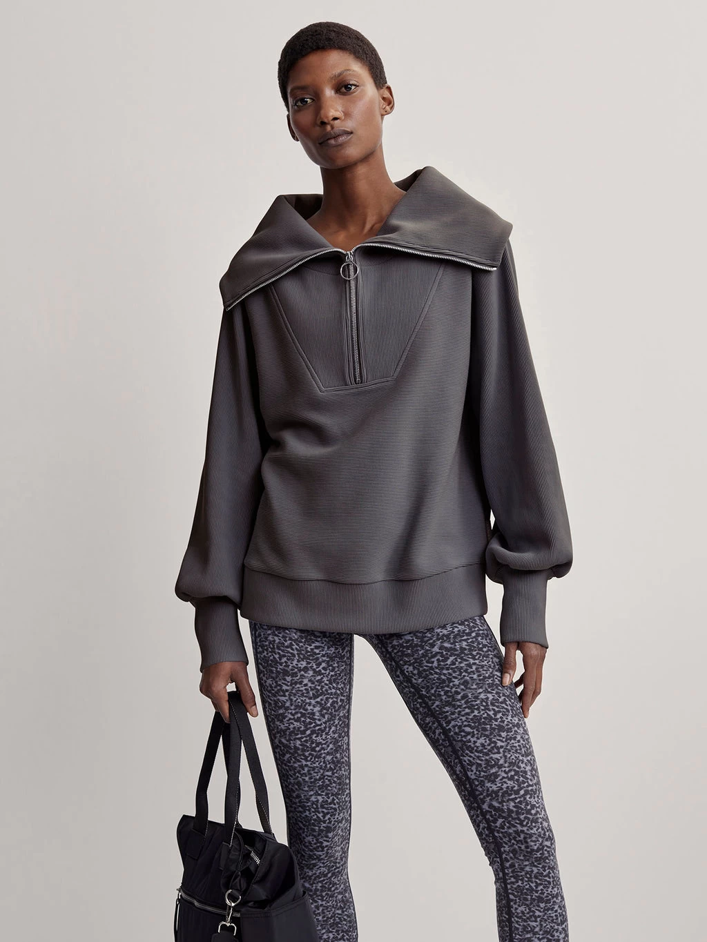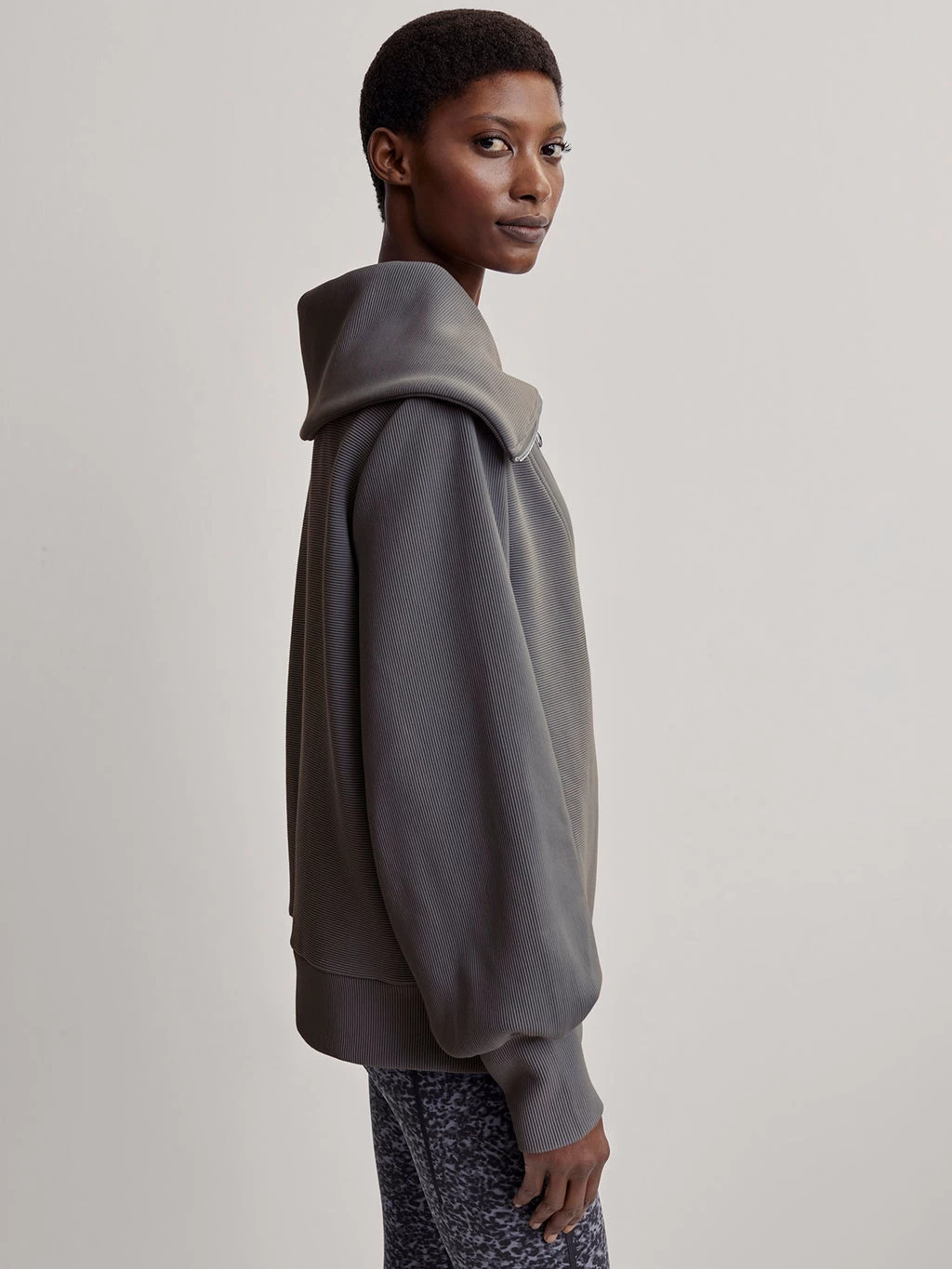 Featuring a high, oversized collar, exaggerated sleeves and a contemporary hoop zipper. Designed to be oversized, wear over leggings or sweatpants to achieve your desired look.